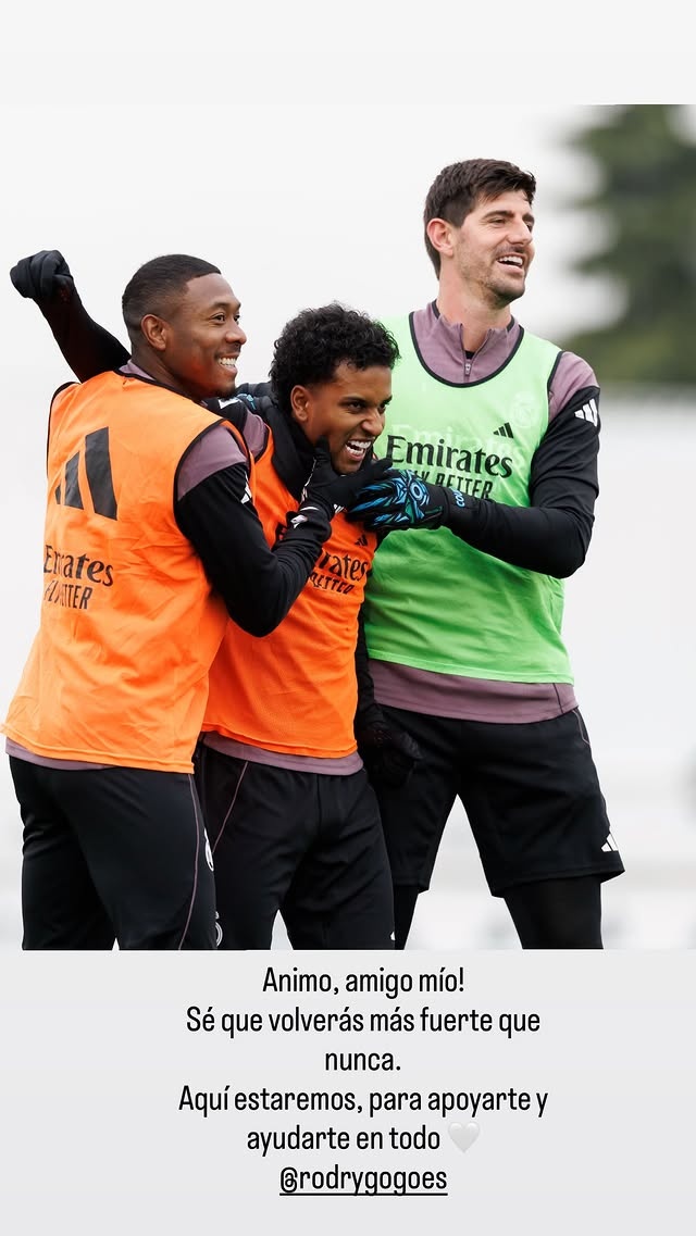在社交媒体上,库尔图瓦晒出了自己和罗德里戈以及阿拉巴在一起的照片,并写道:加油,我的朋友!